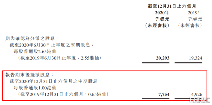值得关注的是,此次,公司公布预计每股普通股派息1.00港仙,相较于2020上半年财年每股普通股派息0.65港仙,同比增长53.85%。