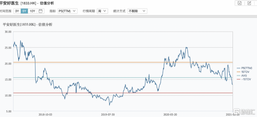 通过近五年(PS)估值走势图表(下图)可知,目前平安好医生的估值处于近五年来的相对较低的位置,我们认为,该情况的出现,叠加较高的增速预期或给公司股价带来较强支持。