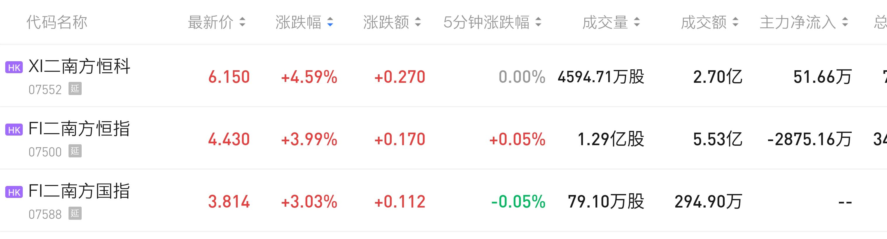 南方两倍做空恒生科技指数ETF(7552 HK)收涨4.59%,