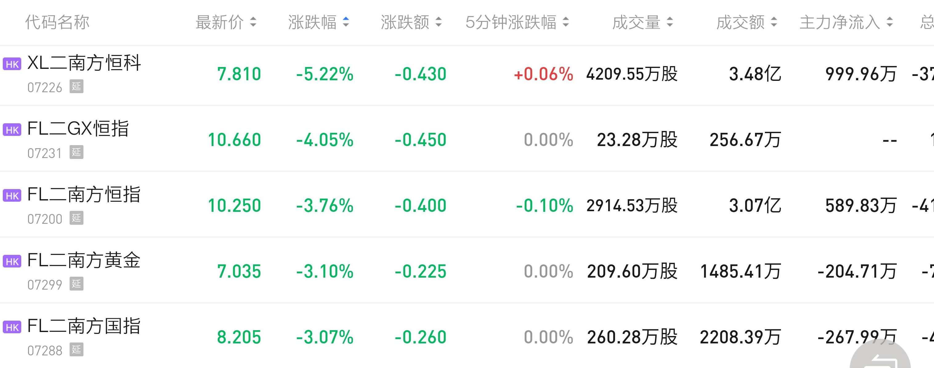 南方两倍看多恒生指数ETF(7200 HK)收跌3.76%,