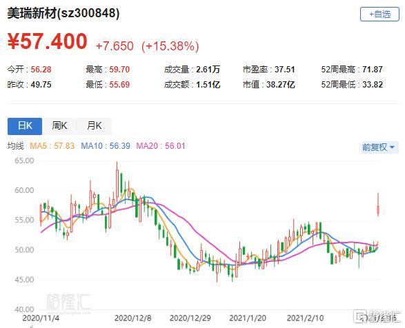 A股异动 | 美瑞新材(300848.SZ)大涨逾15% 2020年净利升22.39% 拟10转10派2元