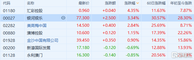 港股异动 | 濠赌股续涨 银河娱乐(0027.HK)涨超3%领涨