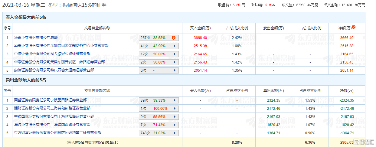 自3月8日以来,前5大买入及卖出席位多数为游资席位,买入、卖出操作十分频繁,其中,东莞证券北京分公司、华泰证券总部、东方财富证券**团结路第二、东方证券上海浦东新区源深路、财通证券杭州上塘路营业部频频现身。