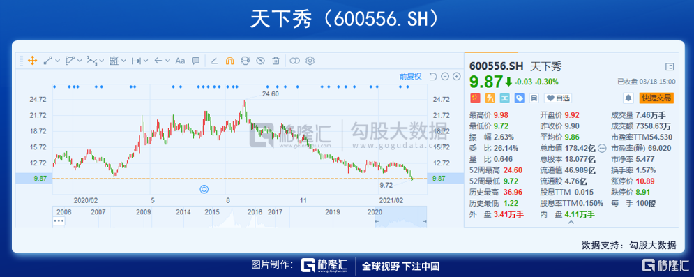 其股价在去年8月掀起涨势,触及24.60元高点,2020年前三季度实现营收22.24亿元,同比增长62.37%;归母扣非净利润2.64亿元,同比增长50.53%,业绩表现算是正向,但基于疫情时期直播带货已成常态,乱象频生,泡沫化风险显著,股价不断走下坡路,早已腰斩,目前总市值为178亿元。