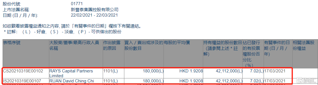 格隆匯APP獲悉,根據聯交所最新權益披露資料顯示,2021年3月17日,新豐泰集團(01771.HK)獲RAYS Capital Partners Limited或其一致行動人在場內以每股均價1.9208港元增持18萬股,涉資約34.6萬港元。