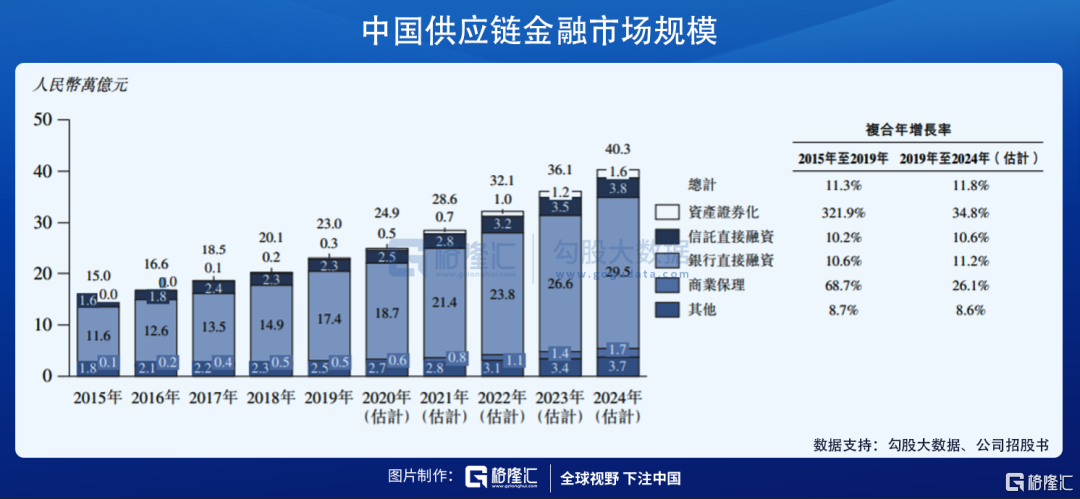 随着国内经济转型升级,产业结构调整深入,实体企业融资需求不断增长,近年来我国供应链金融市场规模不断扩大。根据灼识咨询报告,预计中国国内供应链金融市场总规模将从2019年的23.0万亿元增长到2024年的人民币40.3万亿元,复合年增长率达到11.8%。