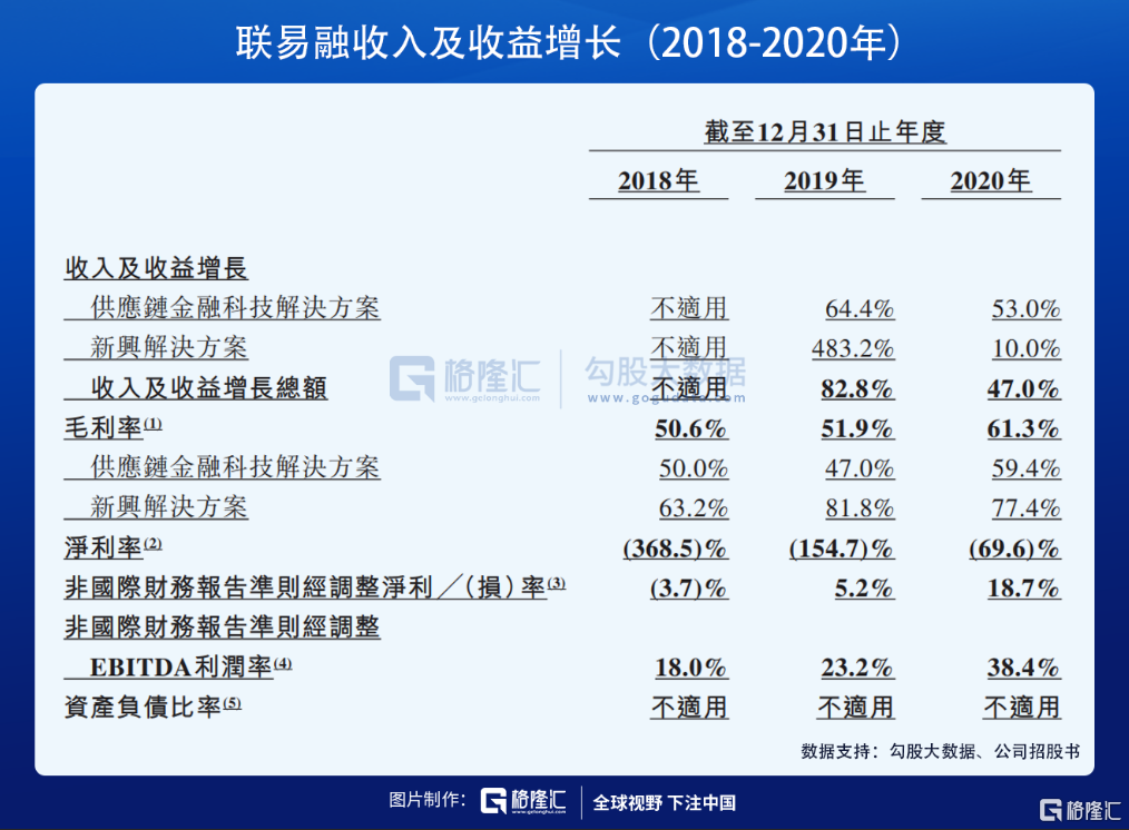 联易融的主要收入由基于交易量收取科技解决方案的服务费用构成,2018年、2019年、2020年,公司来自于供应链金融科技解决方案的收入分别为3.66亿元、6.02亿元、9.21亿元,占总营收的比重分别为96%、86%、90%。公司毛利及毛利率表现优异,2018年、2019年与2020年,毛利分别为1.94亿元、3.63亿元、6.30亿元,毛利率分别为50.6%、51.9%、61.3%。