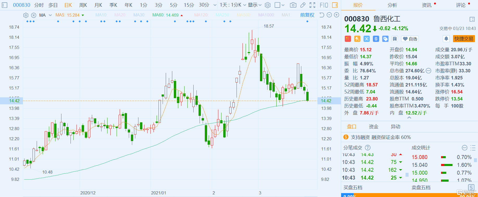 A股异动 | 鲁西化工(000830.SZ)跌逾4% 2020年净利降52.22%