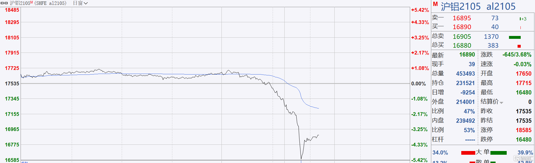 沪铝期货今日快速跳水触及跌停,沪铝期货主力合约现报16890元/吨,跌3.68%,最低至跌停价16480元/吨,创下2月24日以来新低。