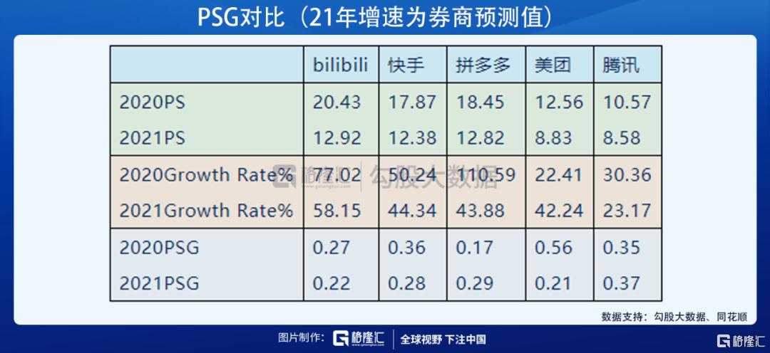 在香港上市的快手,目前市值为1612.76亿美元,20年营收为90.27亿美元,对应当下PS为17.87倍。21年预测营收130.3亿美元,同比+44.34%,现在市值对应21年PS为12.38倍,和B站基本持平。
