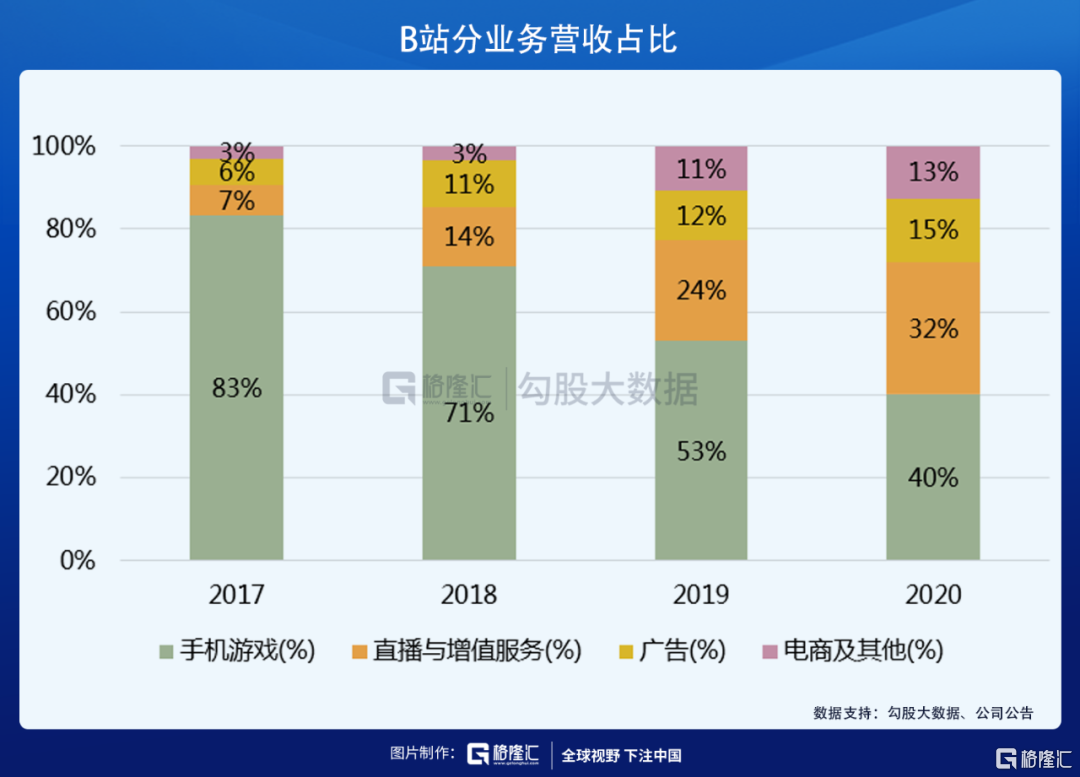 2020年Q4,B站的直播与增值业务营收占比为32%,首次超过游戏的营收占比(29%)。这意味着B站非游戏业务已经正式站出来,原本依赖游戏的局面开始转变,平台其他业务的商业潜力开始释放。