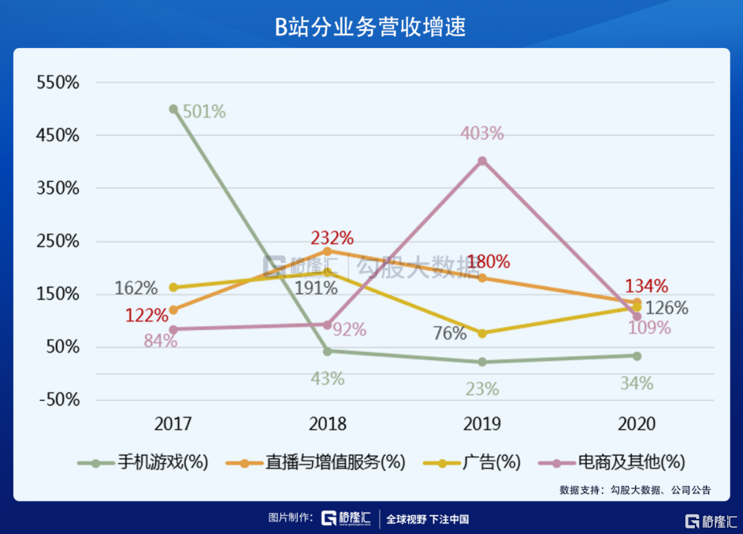 从业务结构来看,B站的业务分为四类:直播与增值服务、手机游戏、广告、电商及其他。