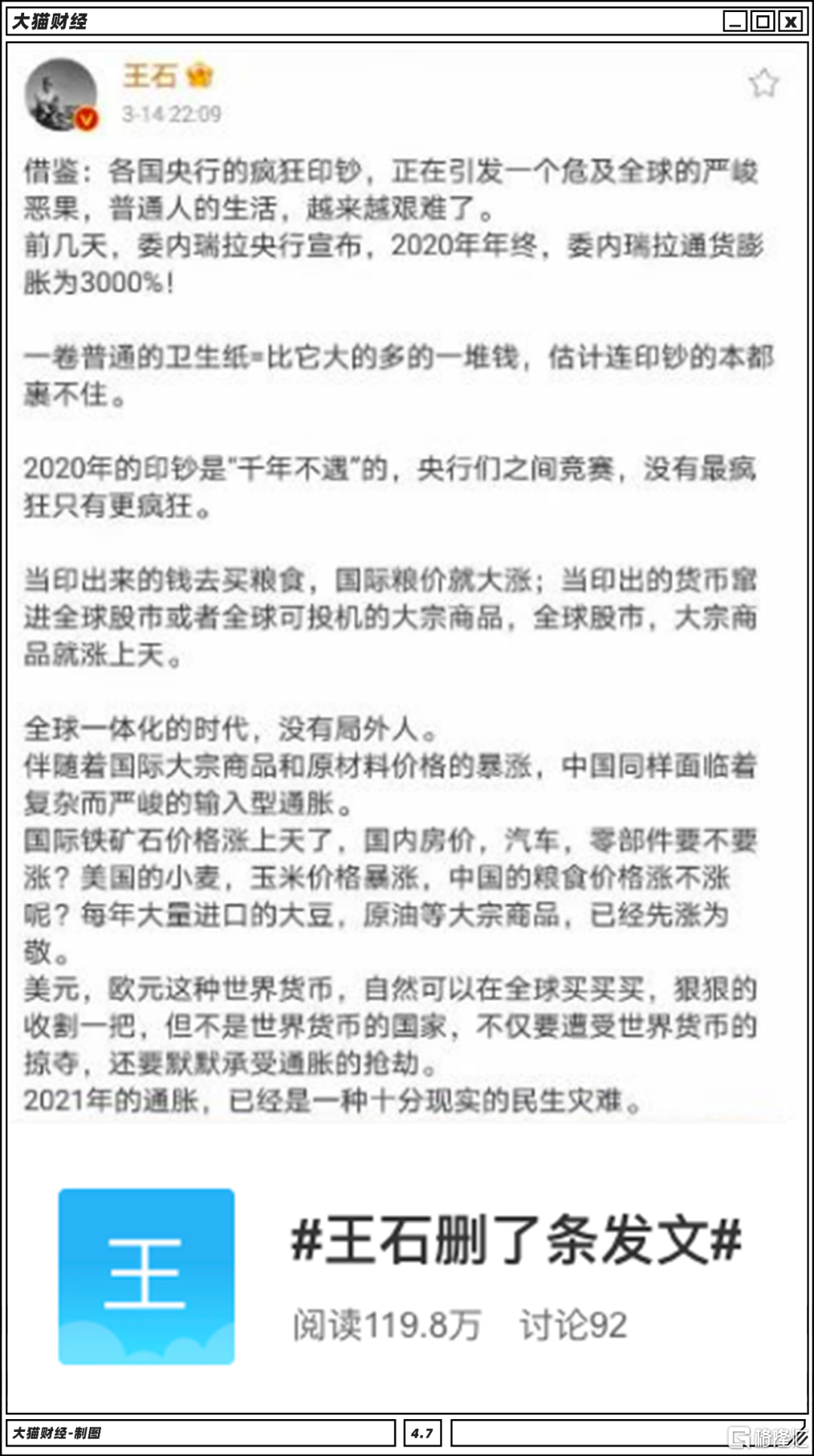主要就是聊了聊疯狂印钞和大通胀之间的关系,不少人支持,也有不少人跳出来冷嘲热讽,老王没过多久就把微博给删了。
