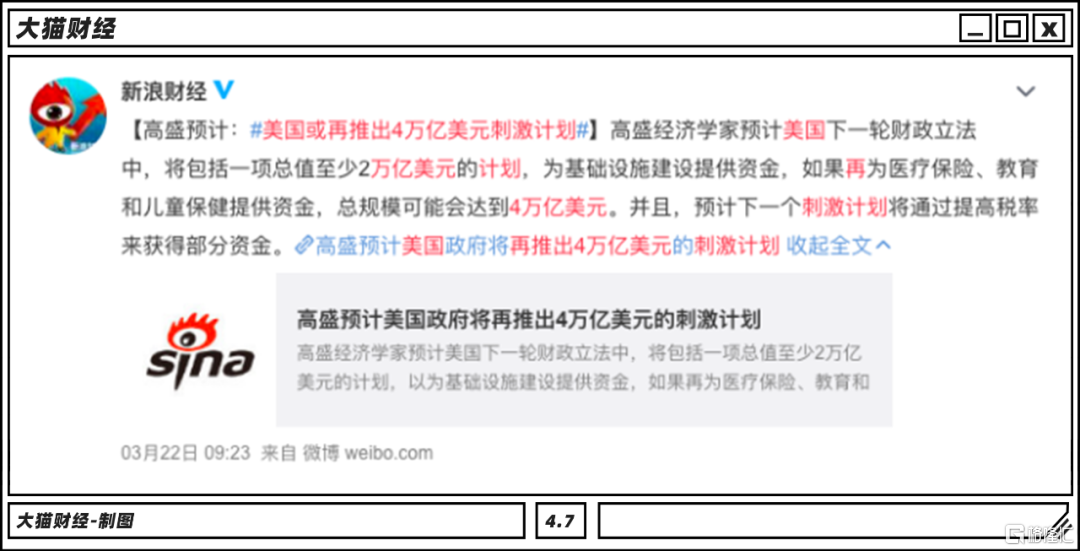 按照他们的分析,美国下一轮财政立法中可能包括一项总值至少2万亿美元的计划,以此为基础设施建设提供资金,如果再算上医疗保险、教育和儿童保健的资金需求,总规模可能会达到4万亿美元。
