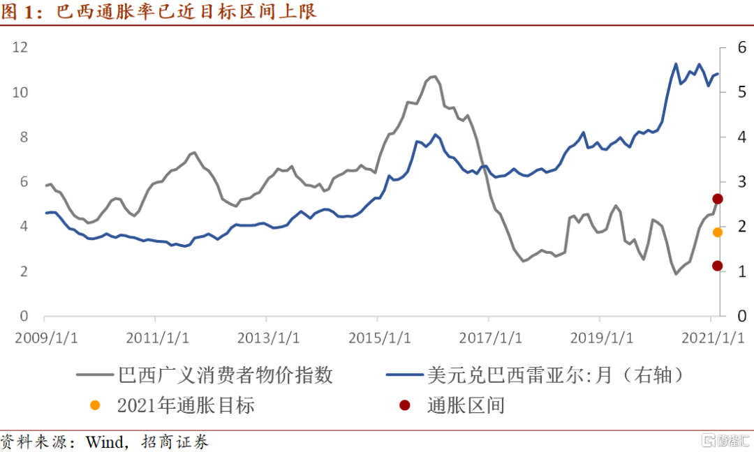 印度可能是下一个加息的新兴经济体。印度的通胀目标区间为4±2%,但是2020年四个季度的均值都超过6%。由于疫情持续严峻,印度央行一直以保增长为首要目标,政府此前主要通过降低关税等方式来减缓通胀压力。根据彭博掉期计算,印度在今年4月7日会议加息0.25个BP的预期达到了117.1%。