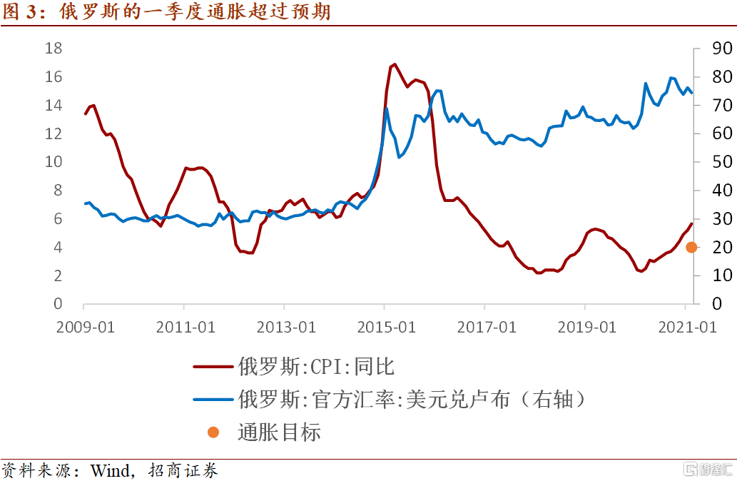 第三,俄罗斯加息的主要考虑在于需求恢复和控通胀。不同于巴西和土耳其,近期国际原油价格上涨事实上有利于俄罗斯经济的恢复。俄罗斯央行表示,“一季度的通胀一直高于预期,国内需求恢复稳定”,“外部需求也将提高,考虑到一些国家的额外财政支持和疫苗接种速度”,“需求的快速恢复和高企的通胀压力要求我们回归中性的货币政策”。总之,“风险平衡已经转而倾向于通胀”。