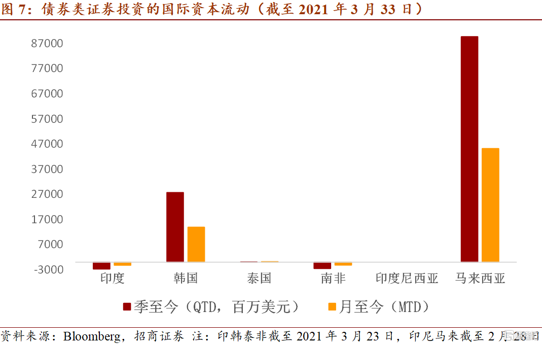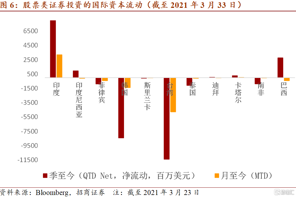 另一方面,国际上宽松的流动性仍在新兴市场寻求收益率。近月数据显示,韩国和台湾的股票市场出现了明显的资本流出,泰国、南非和菲律宾也受一定影响,但是印度和巴西的股市有大幅资金流入。债券市场方面,印度和南非有一定程度的资金流出,马来西亚有大幅流入。