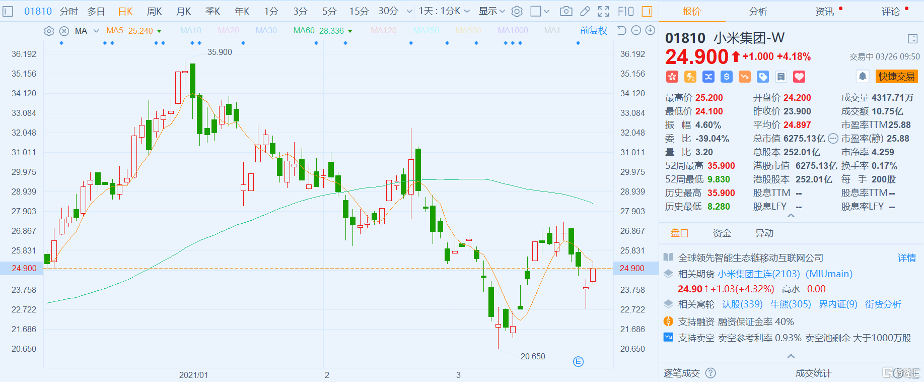 格隆汇3月26日丨小米(1810.HK)涨逾4%,报24.9港元,总市值6275亿港元。小米将于下周一(3月29日)晚上7点半举行小米春季新品发布会,小米继续在社交媒体造势,继小米董事长雷军微博宣传小米11 Pro、小米11 Ultra将登场后,小米最新公布新一代小米MIX也会登场,并且使用液态镜头。小米春季新品发布会举行前夕,雷军喊话“小米要做高端产品,小米手机售价要上万”,但未有提及何时达到新目标。