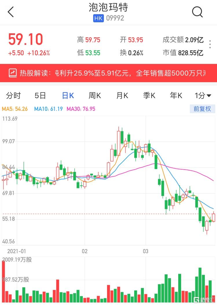 格隆汇3月29日丨泡泡玛特(9992.HK)现报59.1港元,大涨10.26%,暂成交2亿港元,最新总市值828亿港元。泡泡玛特上周五(26日)午间公布2020年度业绩称,期内实现收益25.13亿元(人民币,下同),同比增长49.3%;公司拥有人应占溢利5.24亿元,同比增长16%;非国际财务报告准则经调整纯利5.91亿元,同比增长25.9%;基本每股盈利0.44元,宣派末期股息每股14.94分。作为中国潮流玩具文化的开拓者及主要推广者,2020年,集团一共销售超过5000万只潮流玩具。2020年集团于中国大陆新开业76家线下门店,从2019年末的114家增至2020年末的187家。此外据悉,在业绩交流会上,CEO王宁表示:“希望以后大家提起泡泡玛特不只想到潮玩,我们的乐园业务、内容业务、游戏业务也会在未来逐渐展开。”