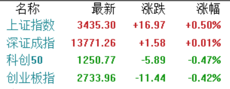 3月29日,三大指数走势分化,沪指在权重股支撑下收涨0.5%报3435.30点,深成指微涨0.01%报13771.26点,创业板指跌0.42%报2733.96点。整体看,两市依旧以观望为主,成交量维持在低位,全天成交额逾7500亿,1800余股上涨,2200多股下跌,北上资金净卖出58.4亿。