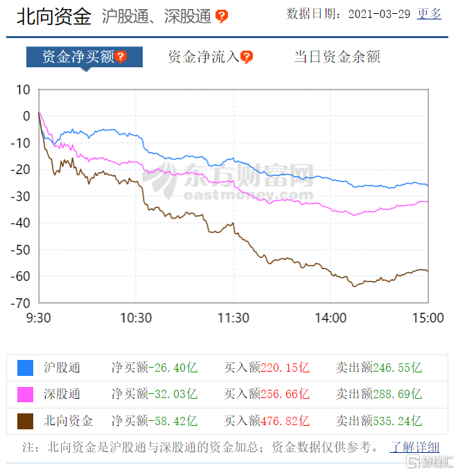 北上资金全天净卖出58.42亿元,其中沪股通净卖出26.4亿元,深股通净卖出32.03亿元。