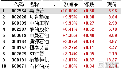 石油采掘板块领涨,中油工程、贝肯能源拉升封板,准油股份涨超8%,中曼石油、恒泰艾普、通源石油等跟涨。