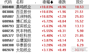 造纸板块今日走高,晨鸣纸业、百亚股份、五洲特纸拉升封板,博汇纸业、宜宾纸业涨超5%。