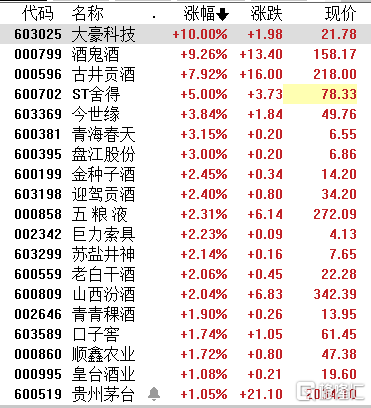 白酒板块反弹,随后出现回落。截至收盘,酒鬼酒涨9.26%,古井贡酒涨近8%,五粮液涨逾2%,茅台涨超1%。
