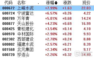 建材水泥股走强,上峰水泥涨近8%,天山股份涨超4%,中材国际、西部建设、祁连山等6只个股涨超2%。
