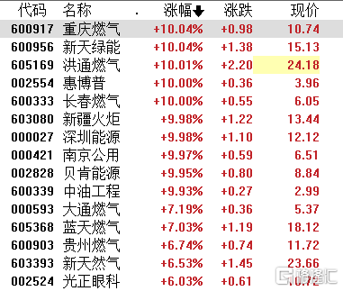 燃气板块再度拉升,重庆燃气、新天绿能、洪通燃气、新疆火炬等多股涨停。