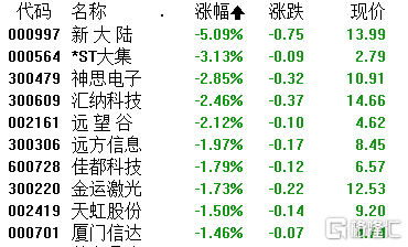 无人零售板块跌幅居前,新大陆跌超5%,神思电子、汇纳科技等跌超2%。
