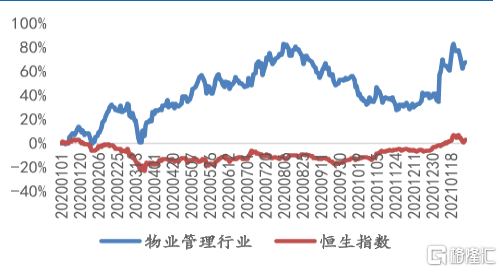 在突如其来的“疫情”黑天鹅面前,物业管理行业抗周期性、抗风险性的属性显著体现出来。物业服务合同周期较长,除项目外拓和部分增值服务可能有短期的影响外,物业服务企业整体收入不会受到太大影响。而二级市场也充分认可了物业股的价值,从去年疫情爆发至今,在许多行业萎靡不振的时候,物业管理行业指数都始终保持增长态势,并远远跑赢同期恒指。