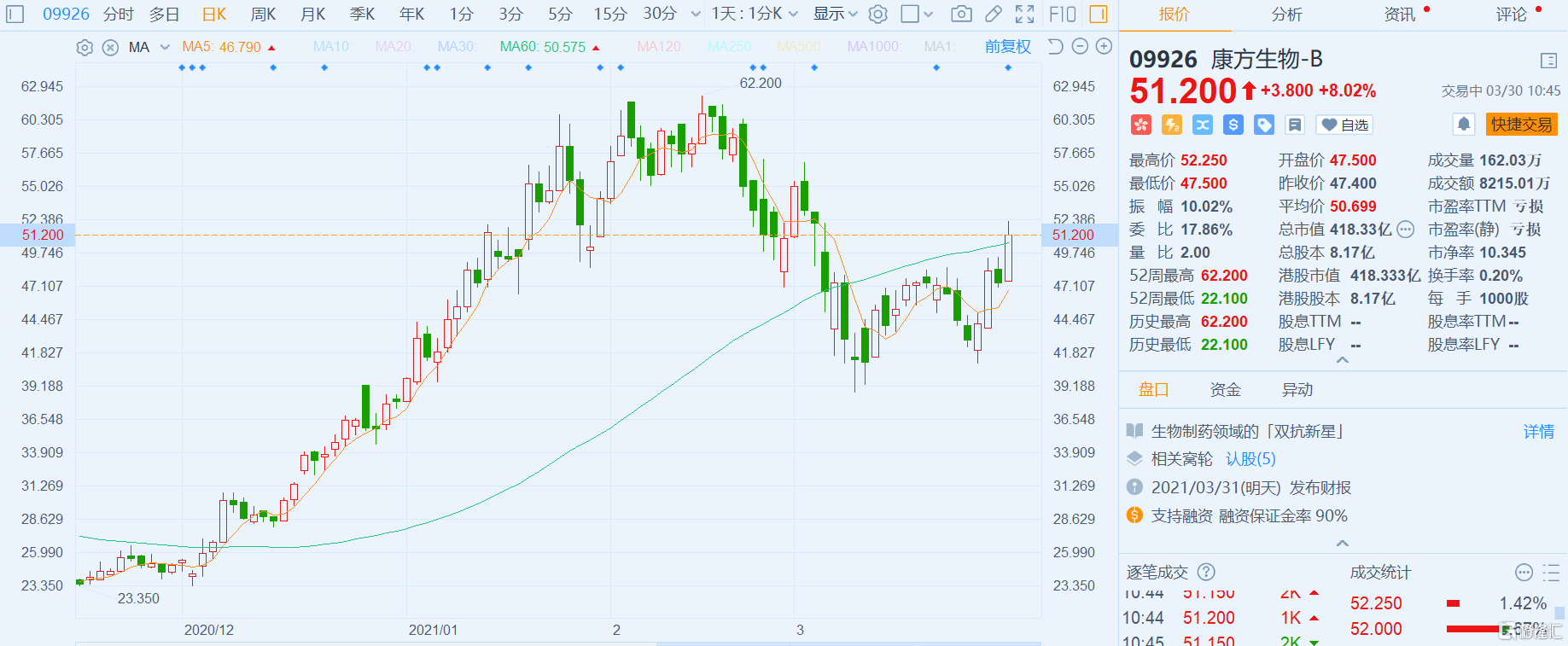 格隆汇3月30日丨 康方生物-B(9926.HK)涨超8%,报51.2港元,总市值418亿港元。康方生物今日发布公告,公司与中国生物制药(01177.HK)共同开发的PD-1单抗药物派安普利单抗(安尼可)(研发代号:AK105)三线治疗转移性鼻咽癌,获得美国食品药品监督管理局(“FDA”)授予突破性疗法认定。这是继FDA授予派安普利单抗三线治疗转移性鼻咽癌快速审批通道和孤儿药资格后,派安普利在美国取得的又一重要进展。这也是公司第二个肿瘤药物获得突破性疗法认定。中国生物制药(01177.HK)则涨约2%。