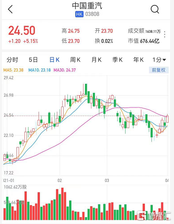 港股异动 | 中国重汽(3808.HK)涨逾5% 年度溢利升89.6%至74.24亿元
