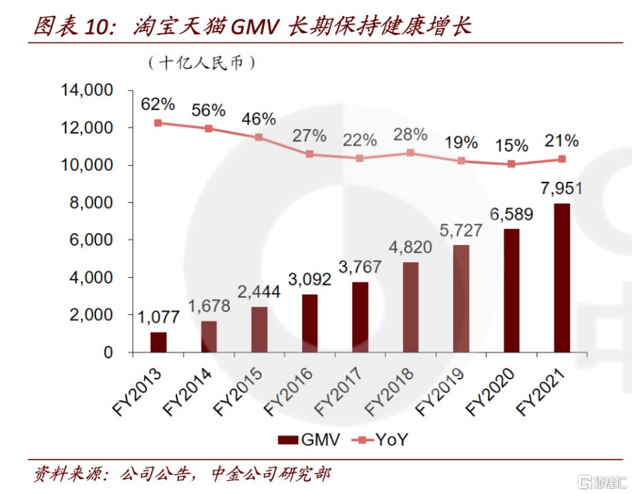 而且,對淘寶天貓來説內容是手段而不是目的,不是所有的商家都具備內容創作能力的,淘寶首頁的微淘變成了訂閲,就是要回歸初心,讓做不了內容的商家專注在店鋪運營上。根據中金觀察,淘寶社區化及內容化的發展路徑,可以通過人找貨和貨找人的配合,中心化流量和去中心化流量的配合,能使商家和消費者更緊密的聯繫在一起。例如淘寶直播,目前已成為一個商家不可或缺的品牌、營銷和分發工具,拉進消費者和商家及主播的距離,提升購物體驗,淘寶直播成交額也在2020年再創新高,同比增長100%以上超4,000億元。