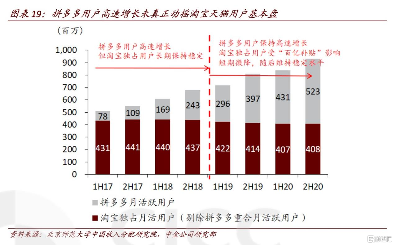 截止2020年底,阿里巴巴擁有7.8億年活躍消費者,消費者年均消費約為9千元左右,而同期拼多多的消費者年均消費約2千元左右,京東的消費者年均消費近6千元。儘管這7.8億年活躍消費者年均9千元的消費已遠高於競爭對手,但中金認為這一平均數仍在某種程度上掩蓋了阿里巴巴的競爭優勢。