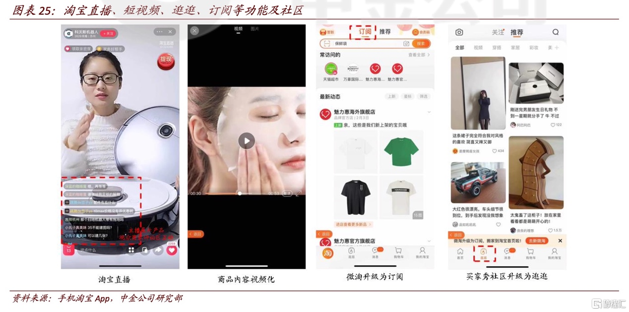 以淘寶為例,阿里正在強調內容化、社區化屬性淘寶的內容化,不是説淘寶要回過頭往社區或媒體的方向走,而是淘寶去加強內容化功能屬性,強化淘寶直播、短視頻等內容形態工具,進一步孵化培養逛逛、訂閲等內容社區,培養消費者更深度、更沉浸式的購物方式,改善用户留存,提升用户粘性。