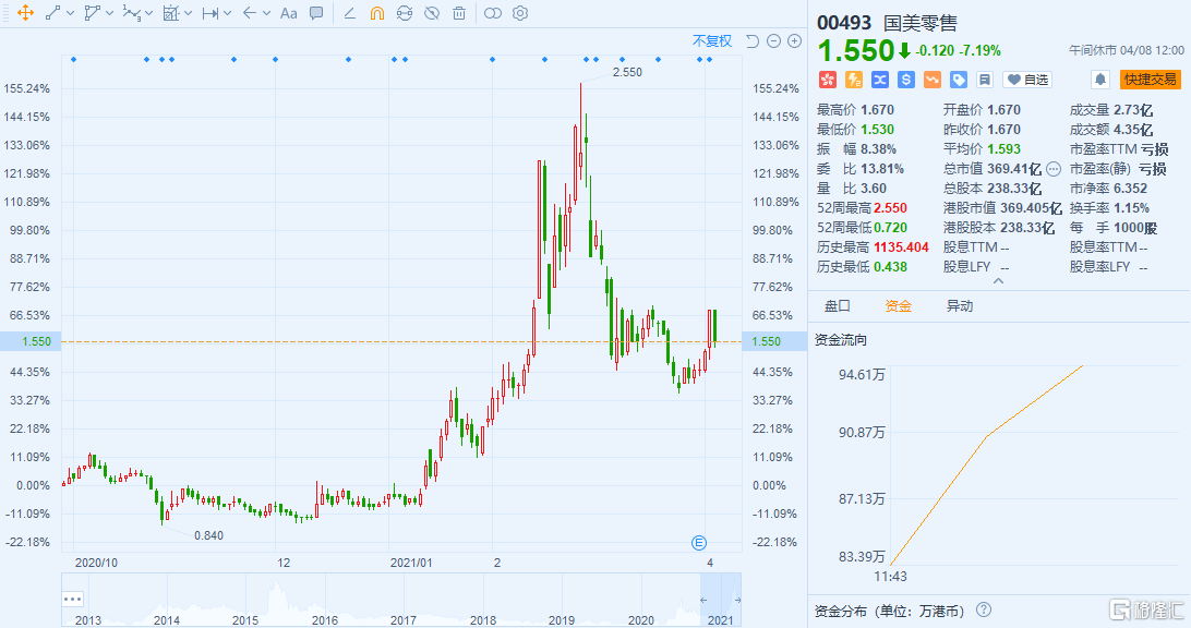 然后就是今年2月16日,黄光裕正式获释。国美零售高开高走,大涨33.93%,收报2.25港元/股,创近六年来新高;拉近网娱也大涨58%。