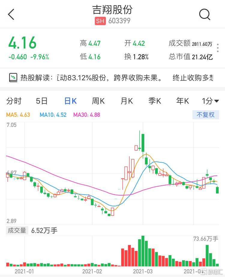 格隆汇4月13日丨吉翔股份(603399.SH)跌停,现报4.16元,封单逾1万手,暂成交2811万元,最新总市值21亿元。吉翔股份曾公布,拟通过发行股份及支付现金的方式收购多想互动83.12%的股份,同时拟募资配套资金。昨日晚间再发公告称,公司虽与交易对方签订了重组意向协议,但本次交易的核心条款始终未能达成一致。经公司与交易对方洽谈协商,现已达成一致意见,决定终止本次重大资产重组交易。