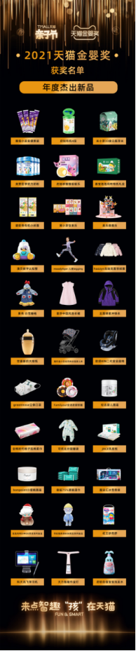 第四屆天貓金嬰獎獲獎名單也於當日揭曉,從新科技、新面料、新設計、新體驗等維度,頒發33個年度傑出新品獎。金嬰獎代表了過去一年,在天貓平台上的3億母嬰親子消費者用購物車“投票”選出的極致單品。與此同時,天貓還頒發了30個具備潛力的新品牌獎。
