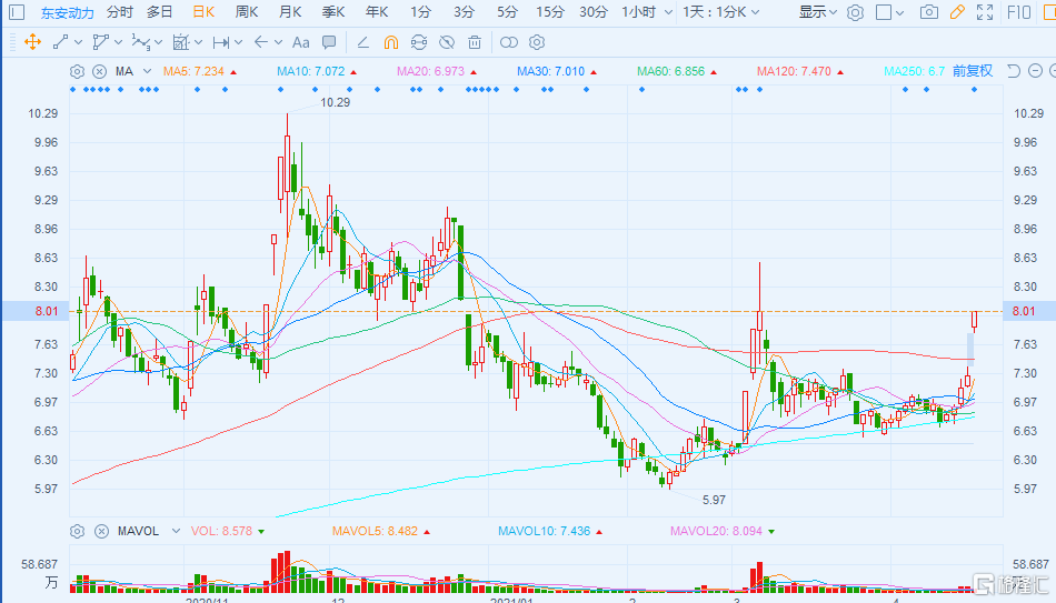 格隆汇4月20日丨东安动力(600178.SH)开盘直线拉升至涨停,封单近30万手。报8.01元,总市值37亿元。东安动力19日公告,预计一季度净利润6200万元-7400万元,上年同期亏损1305.8万元。一季度,公司累计销售发动机12万台,同比增长101.57%;本期合并东安汽发报表,东安汽发一季度由于产品销量增加,盈利能力提高。另外,公司2020年度净利升271.22%至3926.95万元,拟10派0.3元。