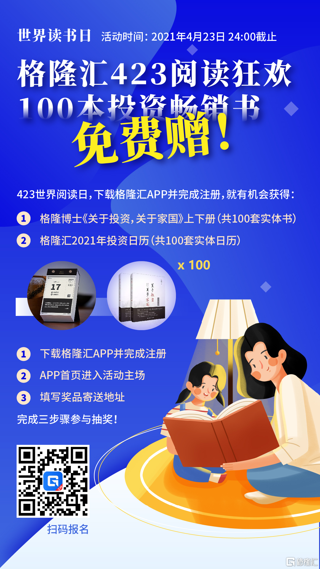 世界阅读日,格隆汇举办《423阅读狂欢 | 100本投资畅销书免费赠!》活动,只要在23日前完成格隆汇APP下载和注册,就能获得《2021年格隆汇投资书单》、《格隆汇2021年投资日历(100份)》、格隆博士《关于投资,关于家国》上下册(100份)等多重好礼!