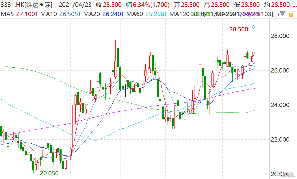 格隆汇4月23日丨维达国际(3331.HK)跳空高开6.34%报28.5港元,股价创去年8月以来新高,最新市值342亿港元。公司今早公布,2021年第一季度总收益增30.7%至44.70亿港元,净利润飙升46.5%至5.53亿港元。