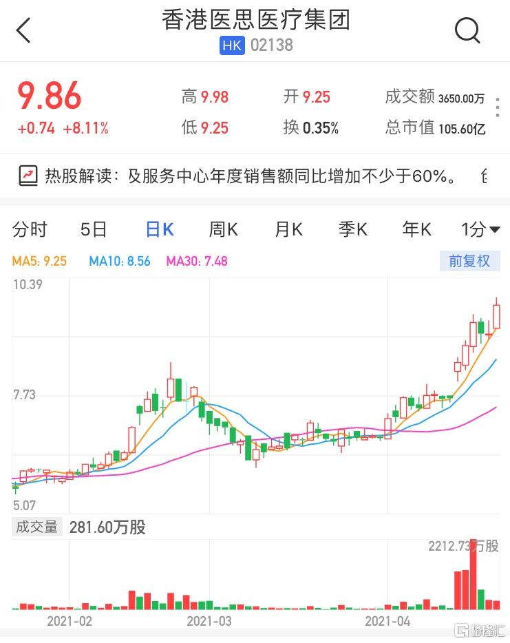 格隆汇4月26日丨香港医思医疗集团(2138.HK)高开高走,盘中高见9.98港元创历史新高,现报9.86港元,涨8.11%,暂成交3650万港元,最新总市值105亿港元。公司上周五(23日)晚间发公告称,公司股份在联交所买卖英文简称将由"UMHEALTHCARE"更改为"ECHEALTHCARE",而中文简称则由"香港医思医疗集团"更改为"医思健康",自2021年4月28日上午九时正起生效。此前公司亦公布,集团预期其位于中国内地的诊所及服务中心截至2021年3月31日止年度初步未经审核销售额录得较去年同期不少于60%升幅。