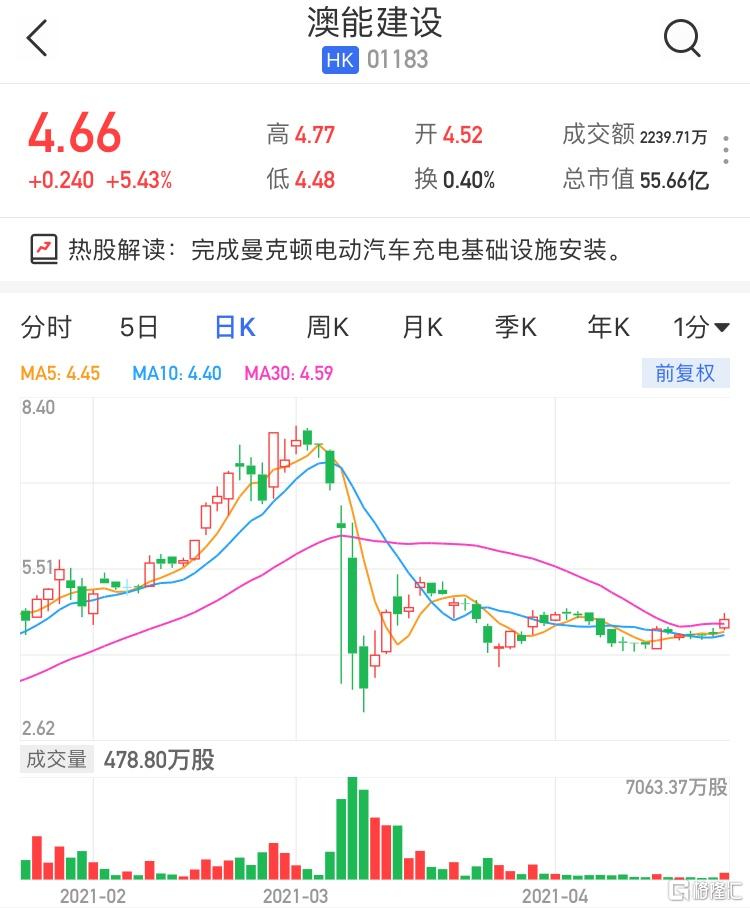 格隆汇4月27日丨澳能建设(1183.HK)现报4.66港元,涨5.43%,暂成交2239万港元,最新总市值55亿港元。澳能建设昨日晚间发公告称,曼克顿(澳门氹仔岛的住宅物业项目)停车场内电动汽车充电基础设施及网络的安装已告完成。曼克顿拥有243个停车位,而第一阶段电动汽车充电设施供货及安装将于2021年4月底开始。集团将与各停车位业主及/或租户订立各别合约。集团将提供的业务范畴将包括为电动汽车充电设施提供设计、供货、安装、操作及维护服务。该合约有效期为七年,客户可根据自身特殊需求申请服务计划。该服务计划将于2021年5月为已与集团订立电动汽车充电设施安装合约的客户推出。