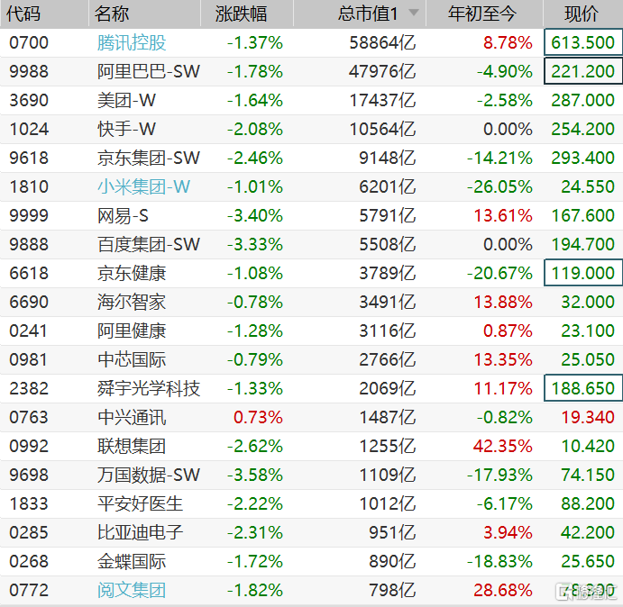 格隆汇5月5日丨隔夜美股因耶伦意外谈及加息下跌,纳指收跌1.88%,带动今早港股市场科技股普跌,恒生科技目前跳水跌1.7%。大市值科技股中,腾讯跌1.37%,阿里巴巴跌1.78%,美团跌1.64%,快手和京东集团跌超2%,小米跌1%,网易和百度集团跌超3%。