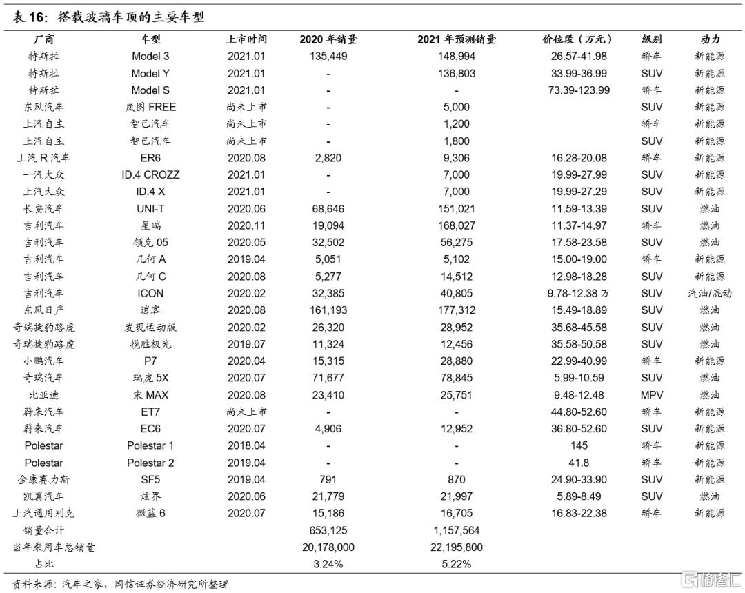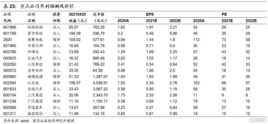 研究复盘:2018年10月我们撰写深度《模块化平台,车企竞争根基》提出车企从单一车型研发,向模块化平台升级,并成为车企竞争根基;12月团队在行业产销持续下滑背景下撰写深度报告《转型升背景下汽车零部件研究框架探讨与投资机会》,提出零部件板块估值处于历史低位,面临电动、智能升级机遇,筛选了具备ASP加速的赛道,叠加进口替代加速,优质赛道中龙头零部件率先逆势企稳;2019年7月在行业持续走弱背景下,我们发布报告《存量与增量:汽车行业空间与机会》提出汽车行业销量尚未见顶,保有量、年产销仍具有较大空间。期间撰写系列深度报告,对车灯(星宇)、热管理(三花)、轮胎(玲珑)、玻璃(福耀)、域控制器(西威)等赛道,以及特斯拉、华为汽车、新势力、大众MEB等产业链进行梳理;2020年,我们撰写了《华为汽车业务现状、竞争格局和产业链机遇》以及《特斯拉复盘、竞争优势与投资机遇》,对华为汽车产业链和特斯拉产业链做了深入的研究和梳理,《国信证券汽车前瞻研究系列(九):量变与质变,汽车玻璃添灵魂》以单车用量和每平米价值量同步提升的逻辑重点推荐了福耀玻璃,同时撰写了《深度|复盘与展望:数字化变革下宇通客车新机遇》,提出客车行业来到了触底反弹的新机遇期,重点推荐宇通客车。在整车企业方面看好比亚迪、宇通、长城、上汽、广汽,在汽车电子方面看好德赛西威、星宇股份和热管理领域的三花智控,在其它零部件方面看好福耀玻璃、玲珑轮胎、骆驼股份,在技术服务方面看好中国汽研。