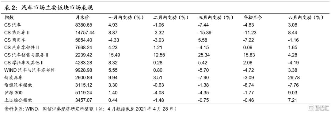 截至2021年4月28日,4月CS汽车上涨4.93%,其中CS乘用车上涨8.87%,CS商用车下降4.33%,CS汽车零部件上涨4.23%,CS汽车销售与服务上涨15.49%,CS摩托车及其他上涨8.32%,新能源车上涨9.94%,智能汽车指数上涨3.30%,同期沪深300指数和上证综合指数分别上涨1.40%和上涨0.44%。总结来看,汽车板块强于大盘,尤其乘用车板块、新能源车板块涨幅明显,智能汽车板块跑赢行业。