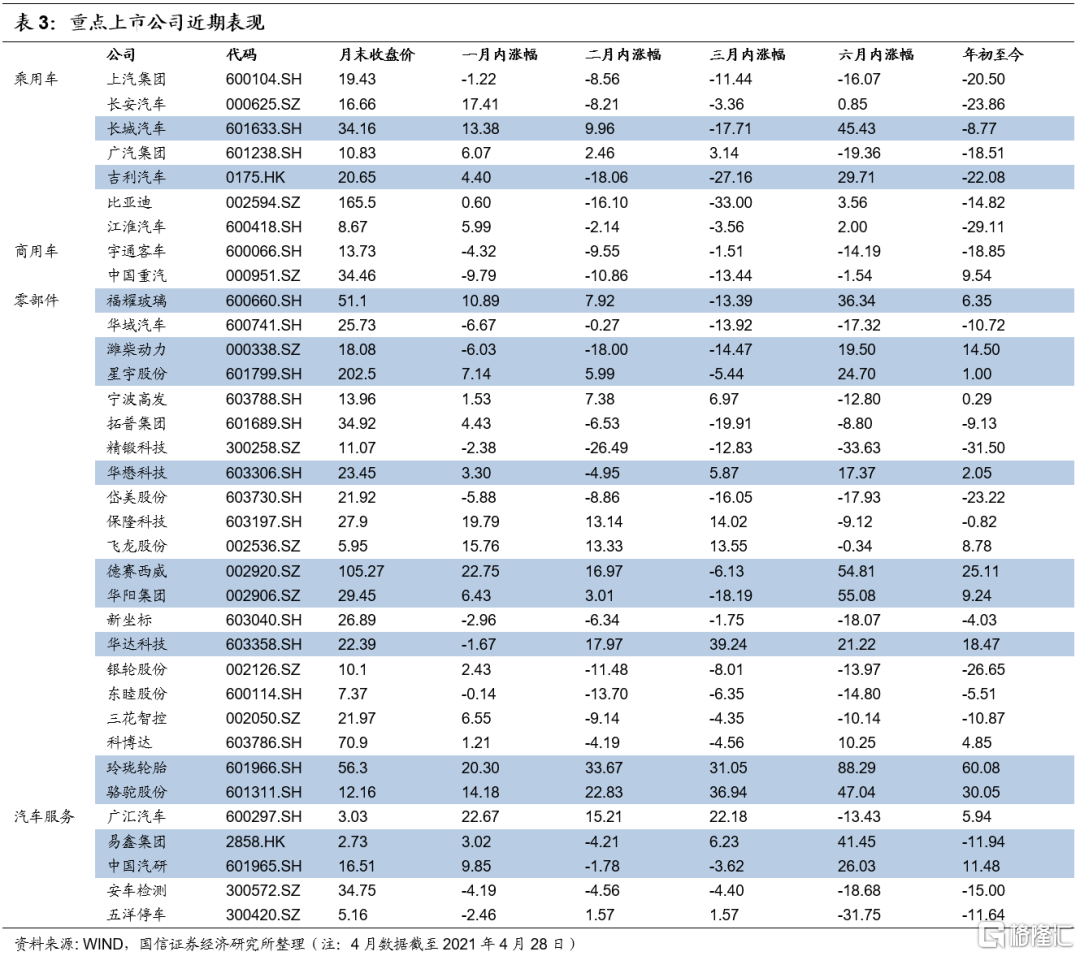 重点关注公司中,近半年来,乘用车板块,长城汽车上涨了45.43%(4月上涨13.38%),吉利汽车上涨了29.71%(4月上涨4.40%);零部件板块,福耀玻璃上涨了36.34%(4月上涨10.89%),潍柴动力上涨了19.50%(4月下降6.03%),星宇股份上涨了24.70%(4月上涨7.14%),华懋科技上涨了17.37%(4月上涨3.30%),德赛西威上涨了54.81%(4月上涨22.75%),华阳集团上涨了55.08%(4月上涨6.43%),华达科技上涨了21.22%(4月下降1.67%),玲珑轮胎上涨了88.29%(4月上涨20.30%),骆驼股份上涨了47.04%(4月上涨14.18%);汽车服务板块,易鑫集团上涨了41.45%(4月上涨3.02%),中国汽研上涨了26.03%(4月上涨9.85%)。