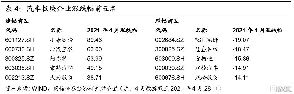 截至2021年4月28日,2021年4月CS汽车板块内涨幅前五的公司分别是小康股份、北汽蓝谷、阿尔特、常熟汽饰、大为股份;跌幅前五的公司分别是*ST猛狮、隆盛科技、爱柯迪、江铃汽车、跃岭股份。